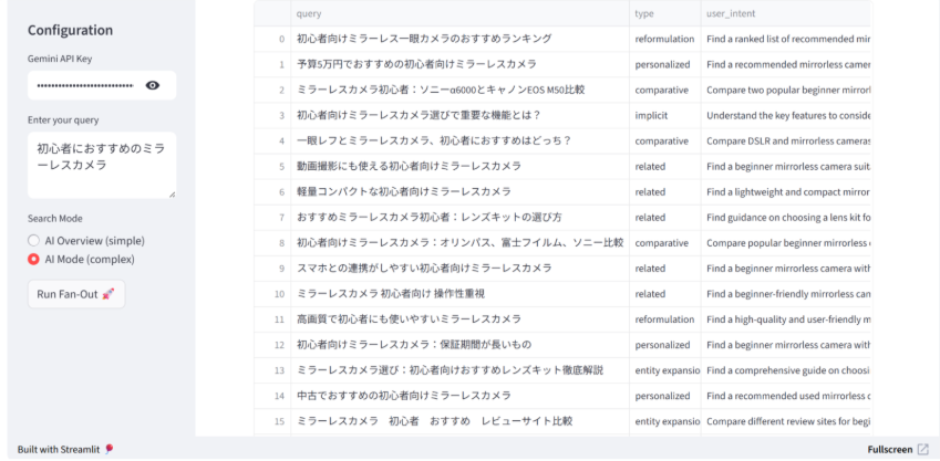 - 分析したいクエリ(例:「初心者におすすめのミラーレスカメラ」)を入力します。